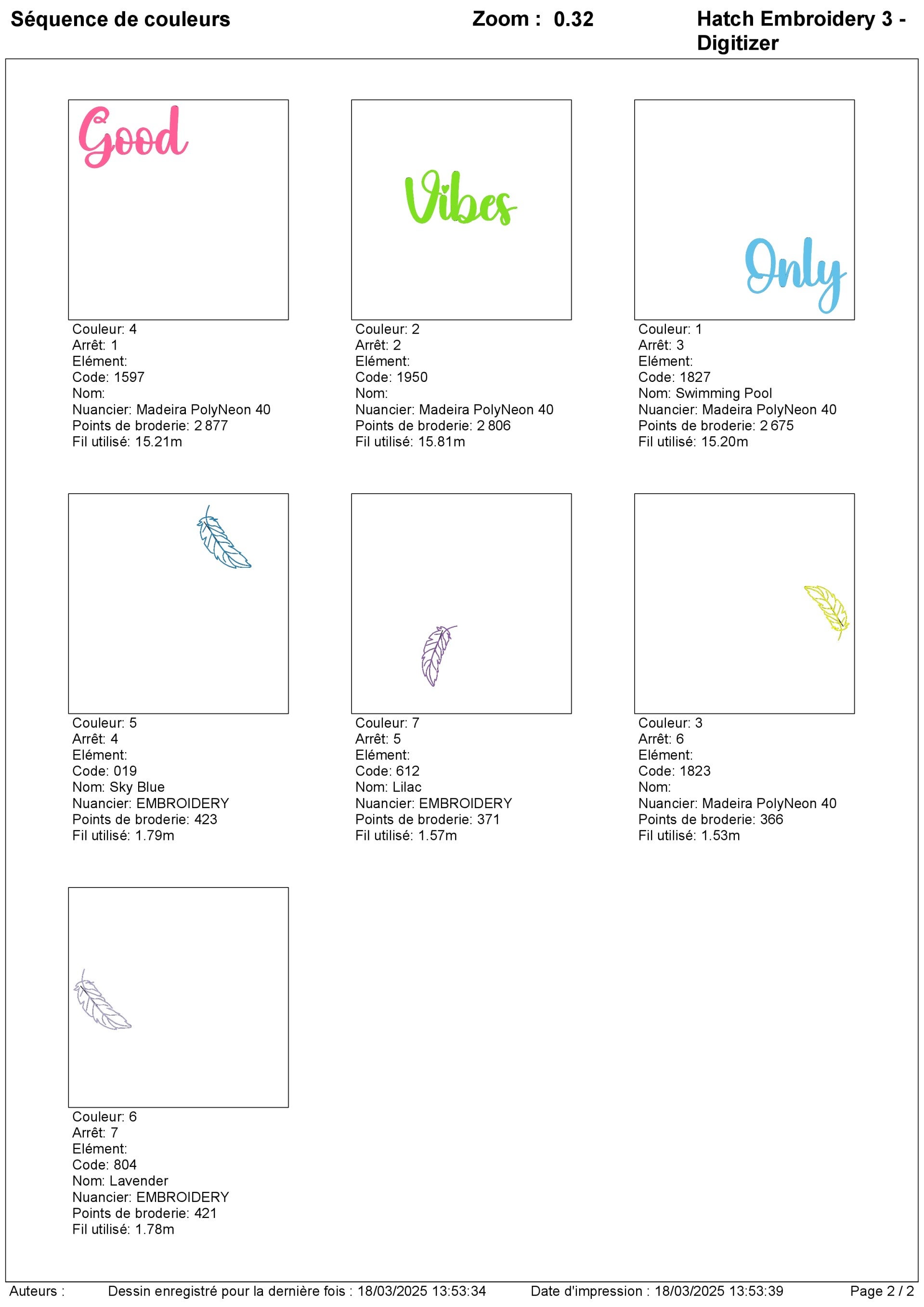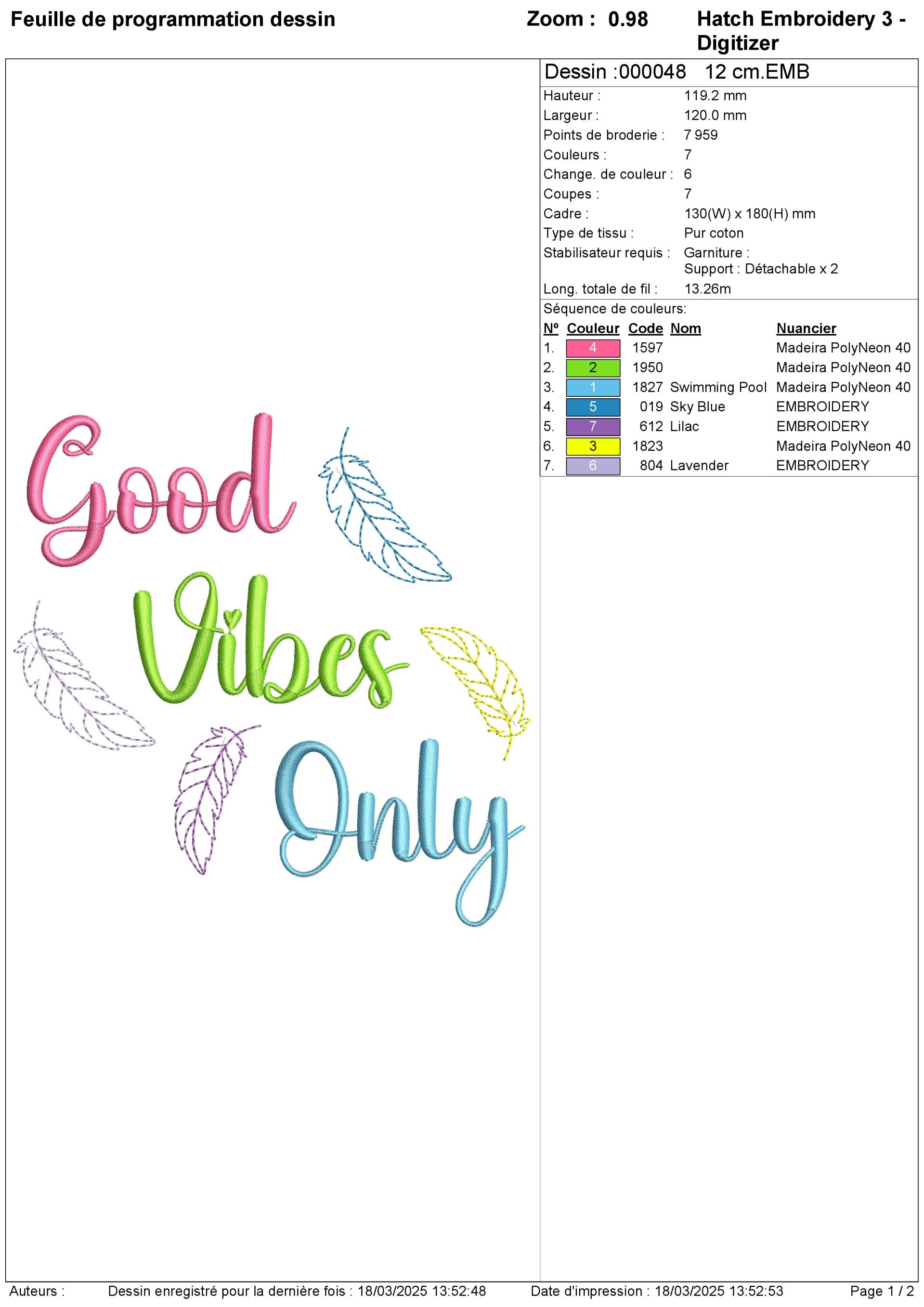 Ajoutez une touche de positivité à vos créations avec ce motif de broderie représentant l'inscription "Good Vibes Only" entourée de jolies plumes. Idéal pour personnaliser des vêtements, tote bags, coussins ou tout autre projet inspirant !