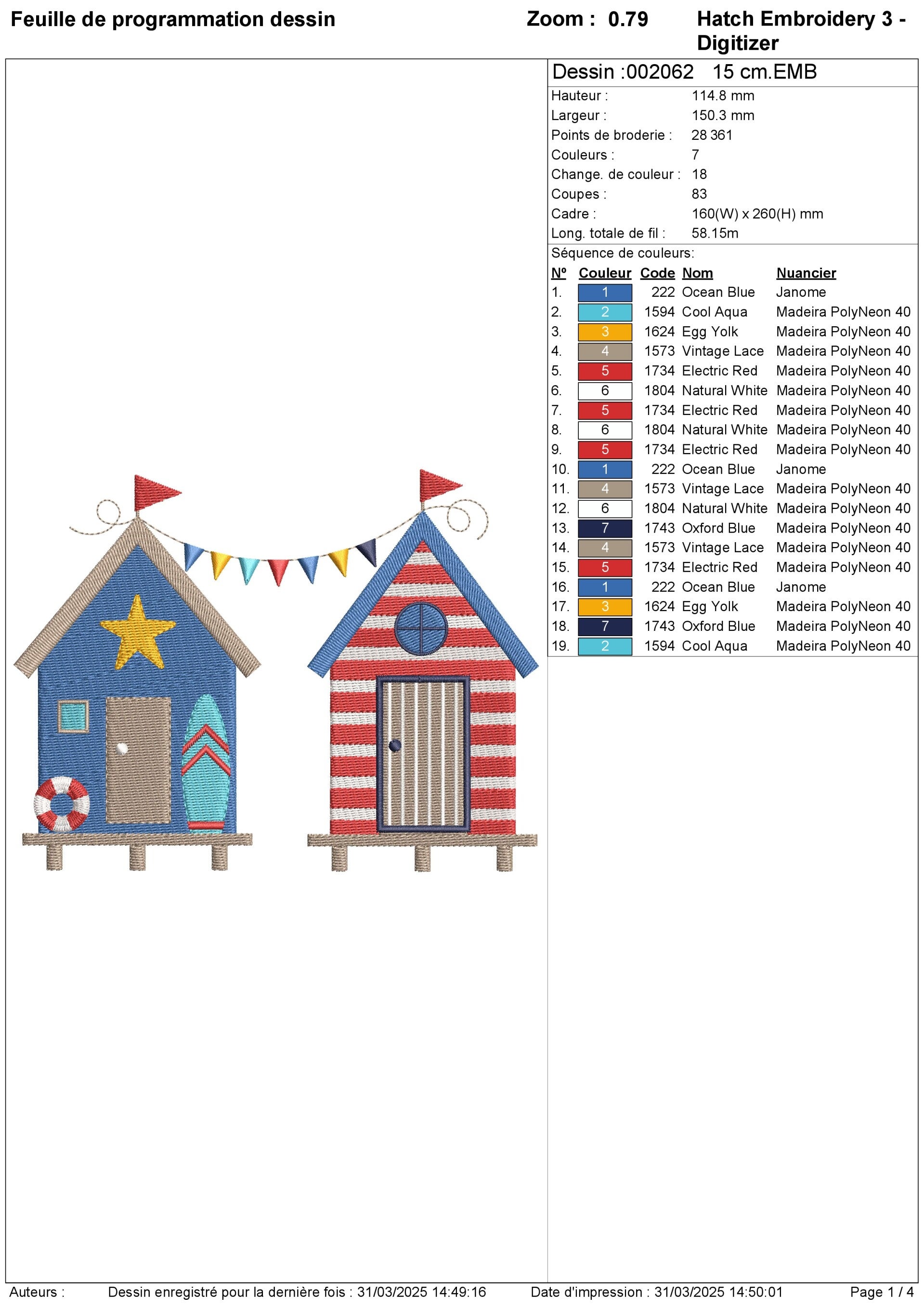 Apportez une touche estivale et bord de mer à vos créations avec ce motif de broderie machine représentant deux adorables cabanes de plage. Idéal pour embellir des accessoires, des coussins, des vêtements ou tout projet de couture au style marin !